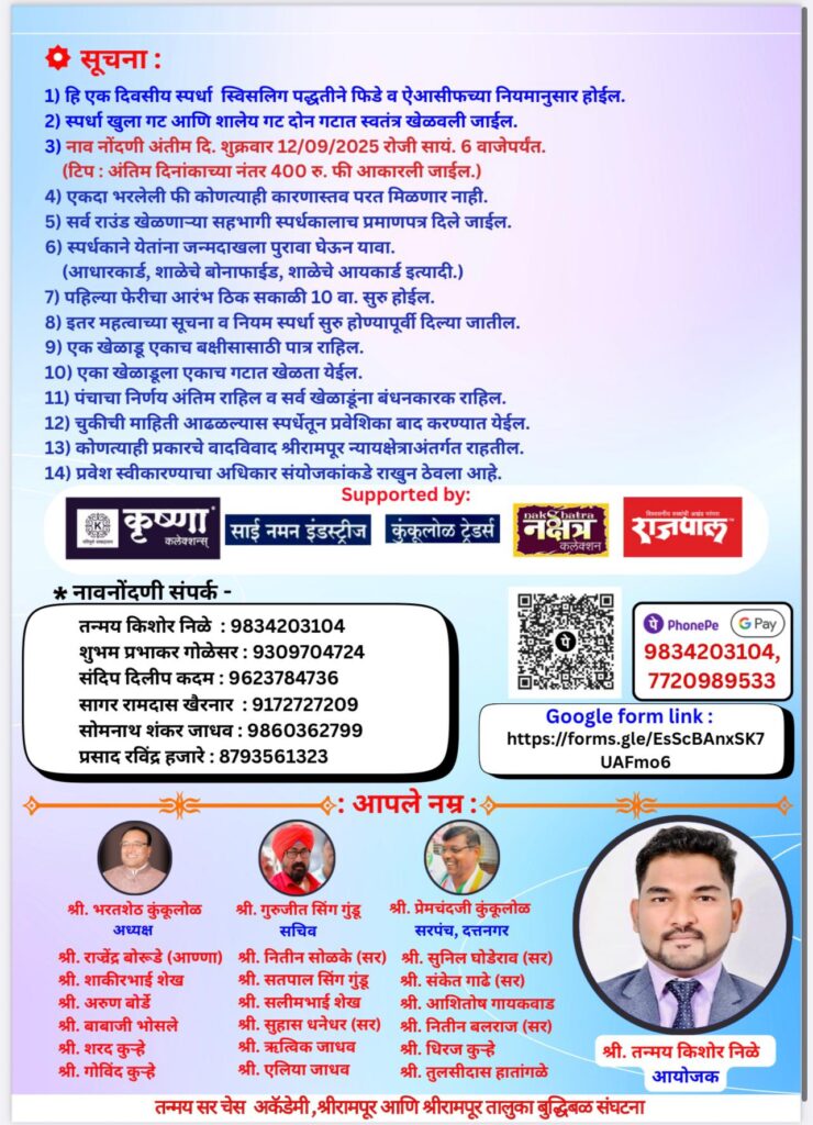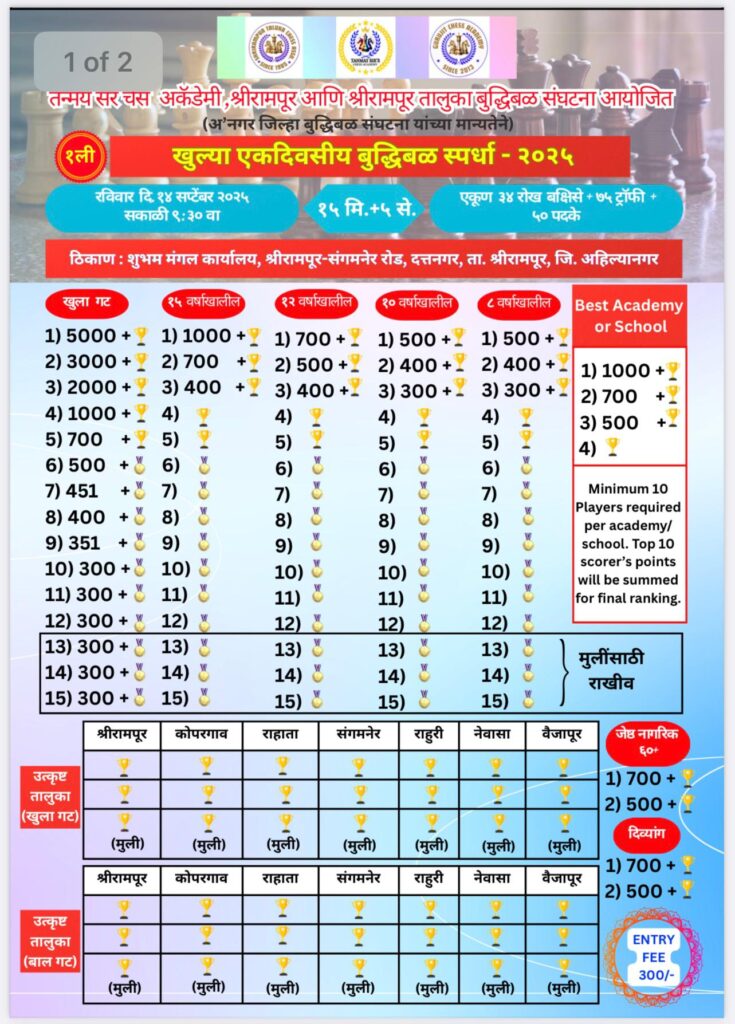तन्मय सर ॲकॅडेमी, श्रीरामपूर आणि श्रीरामपूर तालुका बुद्धिबळ संघटना आयोजित खुल्या एकदिवसीय बुध्दिबळ स्पर्धा 2025